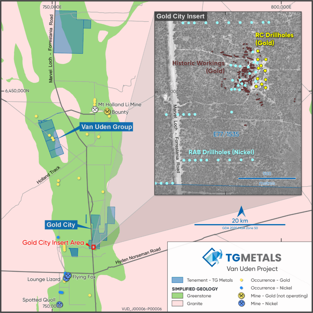 TG Metals have entered a Sales and Purchase agreement (ASX:TG6 4 March 2025) to acquire 80% of the Van Uden Gold Project. The project comprises of two main areas of gold mineralisation in the acquisition tenement package, Van Uden Group Gold Deposit and Gold City Prospect. Past exploration drilling defined extensive mineralisation at Van Uden Group and shallow mineralisation at Gold City.